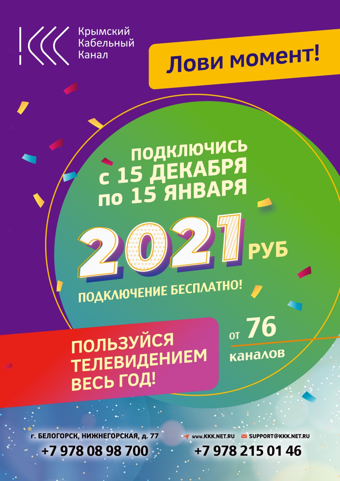 Уважаемые абоненты! График работы в новогодние и праздничные дни 2023 года Мы работаем 31.12.2022 г с 8:30 до 14:00 1, 2, 7, 8 января мы не работаем 3, 4, 5 января режим работы с 8:30 до 16:30 6 января режим работы с 8:30 до 15:30 С 9 января в обычном режиме В праздничные и выходные дни оплатить услуги компании "Крымский кабельный канал" Вы можете следующим образом: - в терминалах моментальных платежей Payberry и QIWI; - с помощью Интернет-банкинга РНКБ; - почта России.